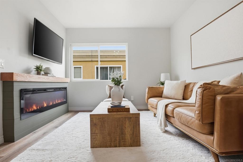 Welcome to this beautifully updated residence in the heart of Imperial Beach. This light and bright home features luxury vinyl plank flooring throughout, an updated kitchen with modern finishes, and a convenient in-unit stackable washer and dryer. The renovated bathroom showcases stylish tile work, a contemporary vanity with integrated lighting, and quality fixtures. The primary bedroom offers a walk-in closet, and both bedrooms are generously sized. Enjoy cozy evenings by the built-in electric fireplace with shiplap surround, adding warmth and charm to the living space. Additional highlights include one assigned parking space and a well-maintained community setting. Ideally located near local shops, dining, and the beach, this home offers comfort, style, and coastal living at its best.