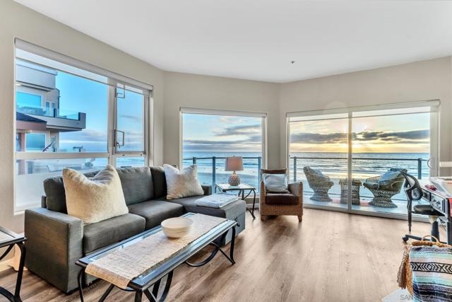 Welcome to Oceanfront Living! This 3BD/2.5BA corner condo offers a bright and open, single-level layout with stunning panoramic ocean views from the kitchen, dining, and living areas. The spacious interior is perfect for guests or extended family, featuring an open kitchen with counter seating for 4, a dining area for 6, and a master suite with walk-in closet and ensuite bath. The open concept living room with cozy fireplace flows on to the wraparound balcony overlooking the beach, an ideal spot to enjoy the sound of the waves, fresh sea breezes, and spectacular sunsets. The boutique building has only 9 units and includes direct access to the sand, two side-by-side secured parking spaces with elevator from the garage up to the condo. A rare opportunity to live directly Oceanfront! Located in the Sea Ranch building, this oceanfront residence showcases floor-to-ceiling windows, high ceilings, and plank flooring throughout, creating a bright and open coastal retreat. The living room w/built-in cabinetry, and a cozy fireplace, extends onto a wraparound balcony with panoramic ocean views. A spacious kitchen with counter seating offers concealed wiring for TV, Audio & Lighting. The dining area, framed by ocean-view windows. Additional features include motorized window coverings in the primary bedroom and living room, a full-size laundry room, utility closet, pantry, freshly painted interior, and abundant natural light. The residence also offers two side-by-side secured parking spaces with elevator access for convenience. Sea Ranch provides a secure entry, underground garage with remote-controlled gate, protective sea wall, and direct access to the sand. From this extraordinary setting, the coastline unfolds from Point Loma to Mexico, with the Coronado Islands in view, all within reach of Imperial Beach’s pier, trails, dining, and coastal lifestyle.